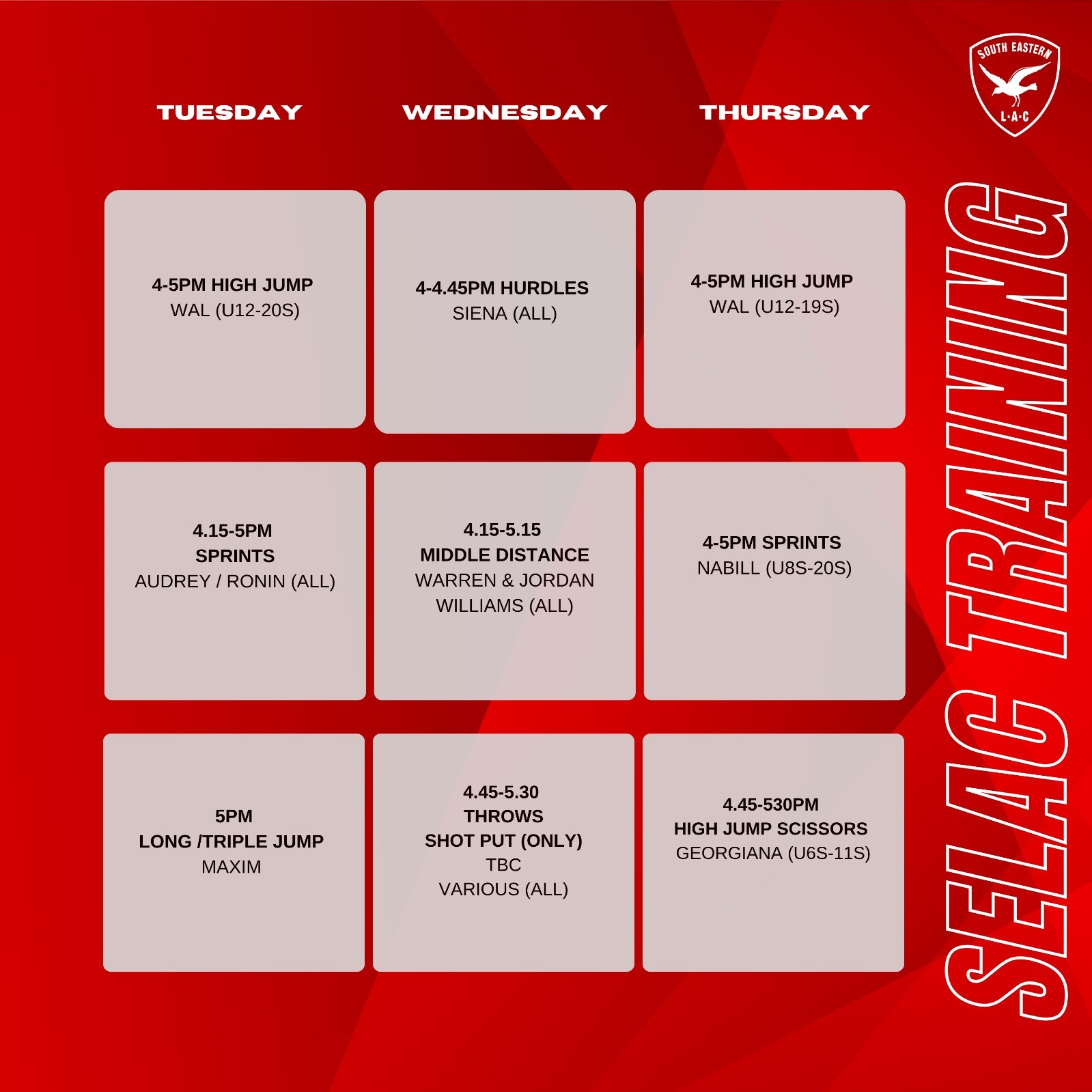 Our training will commence first week of October for registered SELAC athletes who have paid the coaching contribution fee.
